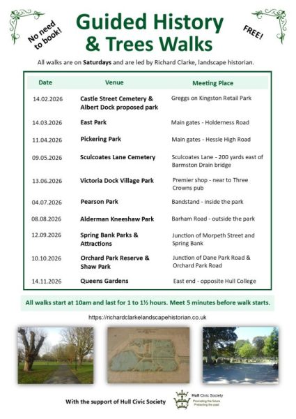 Programme of visits for this year. Hope to see you there, first one a week on Saturday. Bring an umbrella – last year for the Pearson Park visits and those to Parks, Open Spaces and Cemeteries, 20 in all, not a drop of rain was felt! An umbrella can, of course, double up as a pointing stick.