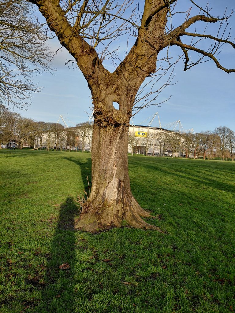 Today’s photo shows one of the horse chestnut trees forming the avenue that led from West Park’s main gates off Anlaby Road to an original large heated conservatory that no longer exists. This particular tree has a rectangular hole at the top of its short main truck (horse chestnuts normally have low sturdy main trunks).
